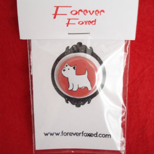 Cute West Highland Terrier on a lovely shiny badge with a metal pin back.