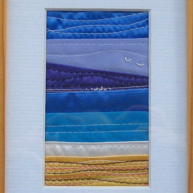Horizontal strips of satin make up this tiny picture. The sheen on the fabric capture the intense colours of the landscape. Extra detail added in machine and hand embroidery.