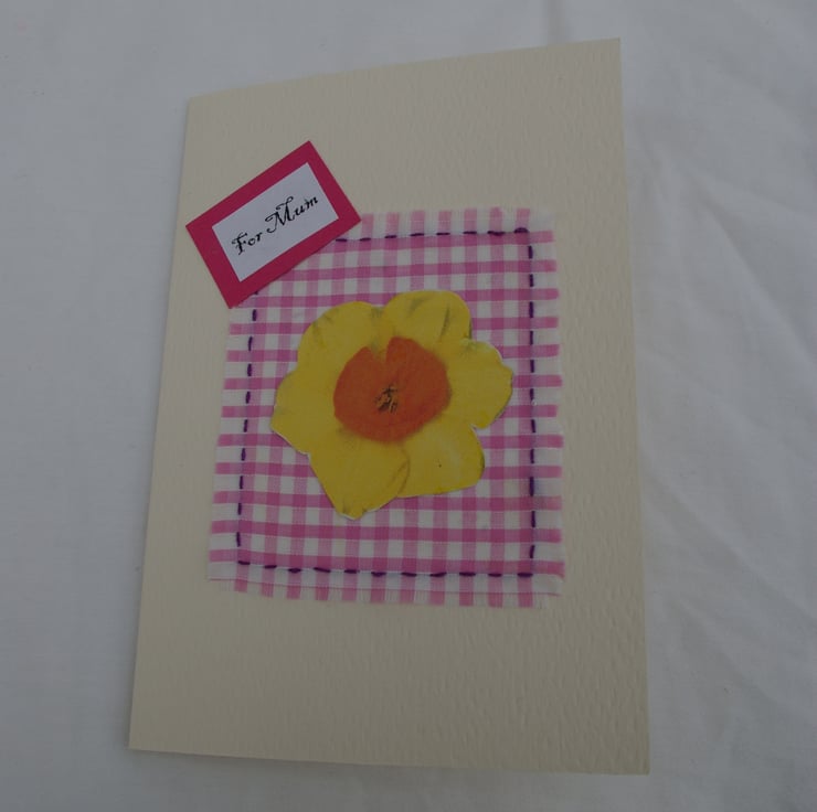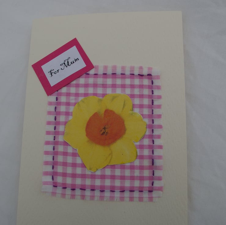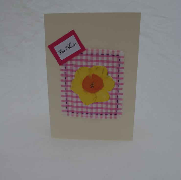A pretty mother’s day card, hand made in a country chic style. The centre of his card is a large bright image of one of my own home grown daffodil flowers. This is then affixed to a pink and white gingham check cotton material which I have hand stitched a boarder in purple embroidery floss. The gingham material has then been frayed around the edge.
