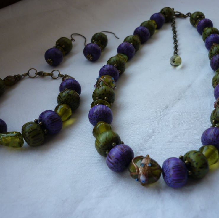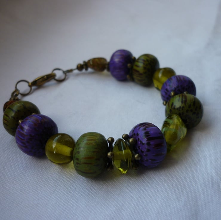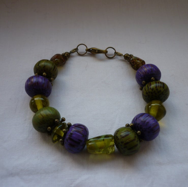 THIS BRACELET HAS BEEN MADE WITH WOODEN DOUGHNUT SHAPED BEADS IN RICH MOSS GREEN AND RICH PURPLE ALONG WITH MOSS GREEN GLASS BEADS, ANTIQUE BRONZE SPACERS AND FINISHED WITH BEADING WIRE, ANTIQUE BRONZE FINDINGS AND LOBSTER CLASP.