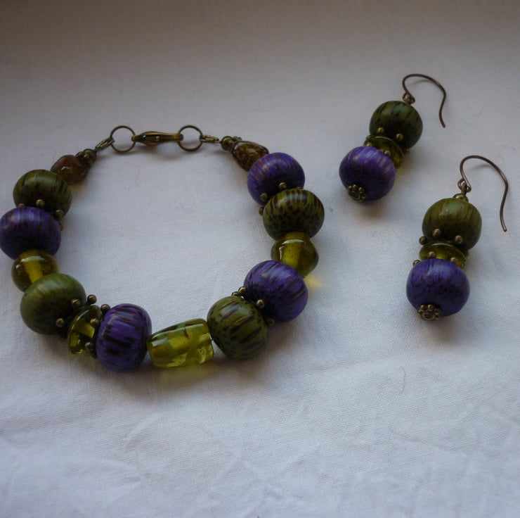THE EARRINGS HAVE BEEN MADE WITH DOUGHNUT SHAPED WOODEN BEADS IN RICH MOSS GREEN AND RICH PURPLE ALONG WITH MOSS GREEN GLASS BEADS, ANTIQUE BRONZE SPACER BEADS AND FINISHED WITH NATURAL VINTAG BRASS ROUND EARRING HOOPS.