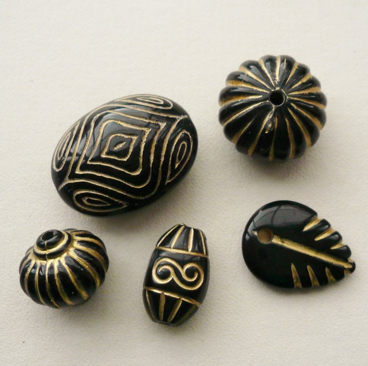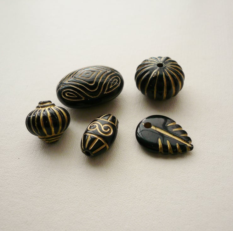 This listing is for 5 x black and gold patterned acrylic beads in different shapes and designs.