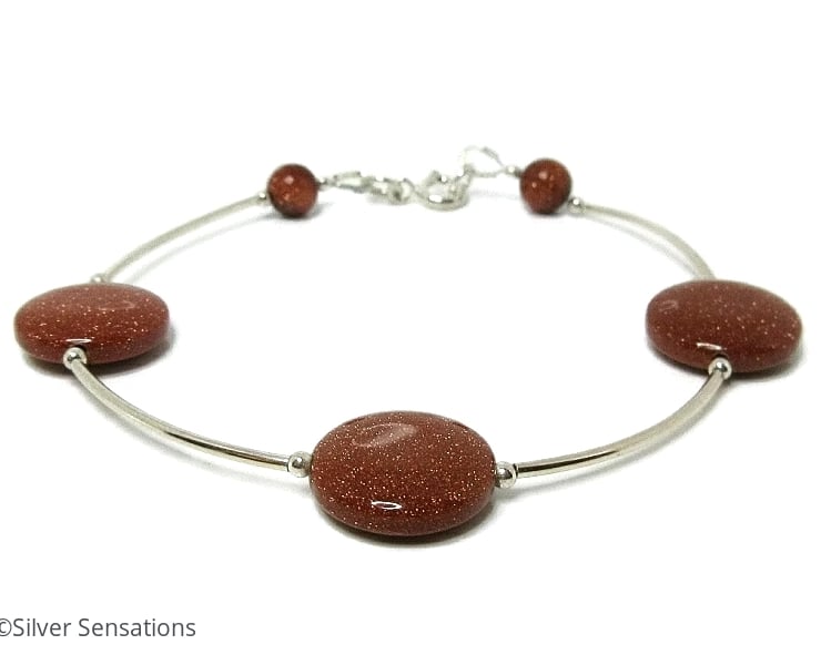 This elegant & feminine handmade Sterling Silver bracelet has sparkly tan brown Sandstone Goldstone coin beads which are 14mm in size.