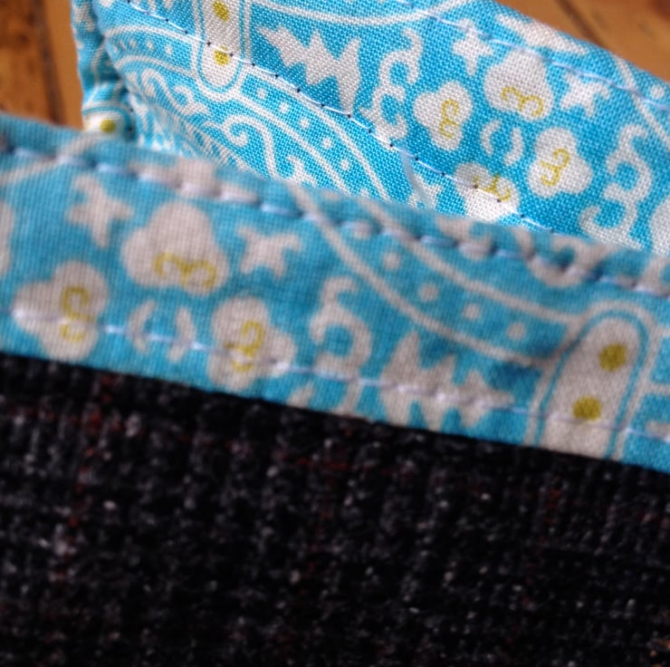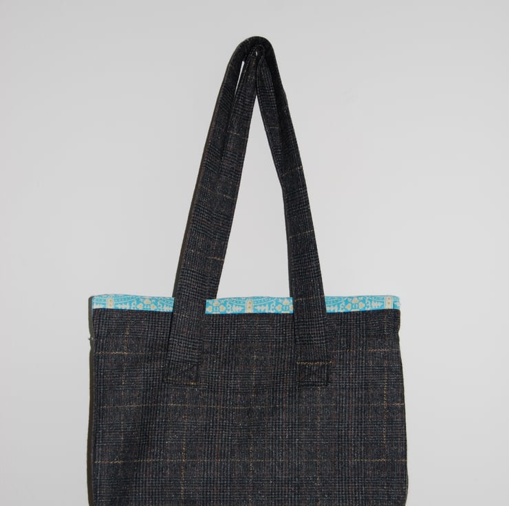 Uniquely designed handbag. The outer bag is made from upcycled Mango 100% wool tweed trousers, (interfaced for extra stablity). The inner lining is made from designer 100% cotton fabric. The bag has one zipped interior pocket and one interior patch pocket to help organise your bits and pieces. The bag itself has a secure magnetic closure to keep your valuables safe. The secure handles are long enough to allow the bag to be worn on the shoulder and not too long if you want to carry the bag on your arm or in your hand. The bag has an integrated gusset which means there is plenty of room. The approximate size of the bag is 10 inches high by 11 inches wide and 3.5 inches deep. Free postage and packaging.