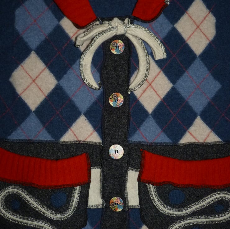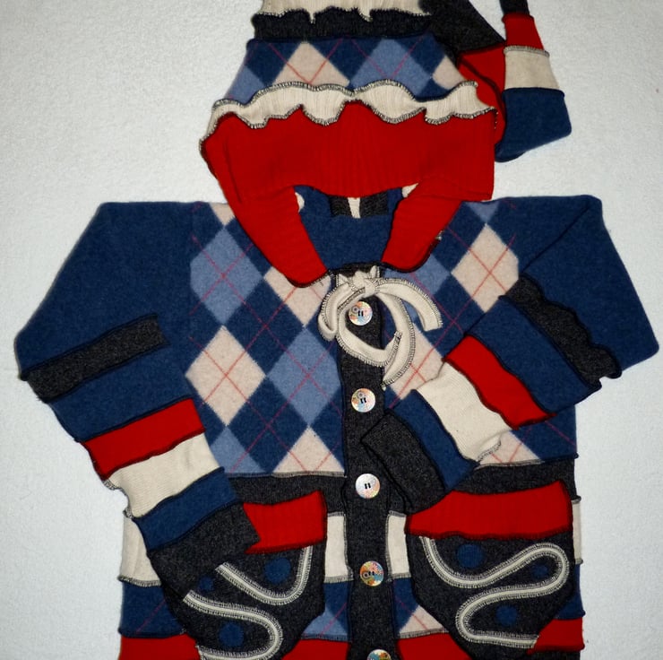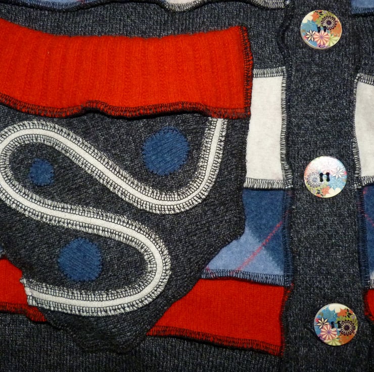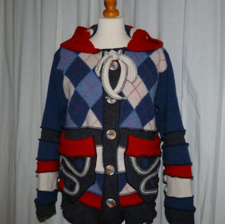 This fantastic up-cycled jacket is created from wool jumpers. These are previously loved and recycled jumpers, that I have washed in a hot temperature and pre-shrunk. I have then cut and re-stitched the jumpers, with all seams being professionally finished with a serger/overlocker, to create this fabulous top.
