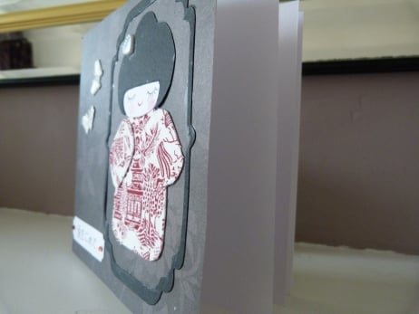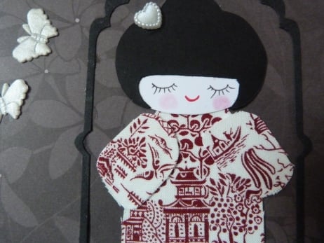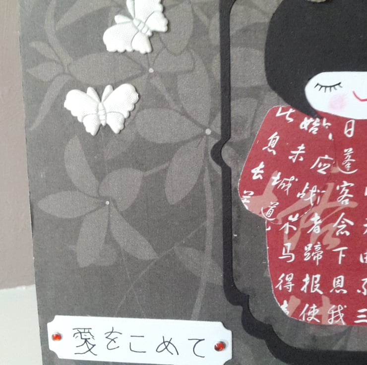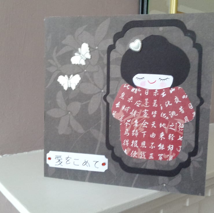 A total of five cards, 2 original design and 3 new design, reserved for Diane. A completely hand made and unique design of a very pretty kokeshi doll made from japanese style cotton fabric mounted onto card. Mounted onto dark brown floral paper which has then been mounted onto quality white card. Her hair has been adorned with pearl plastic heart. Finished off with two fabric butterflies and a tag with the words with love in Japanese embellished with two red rhinestones.