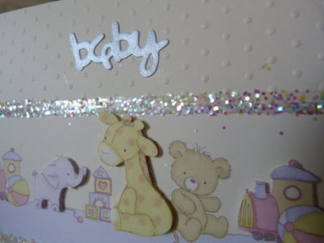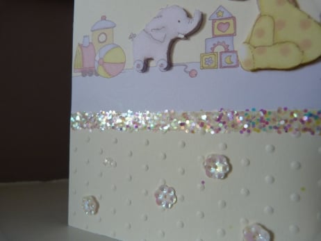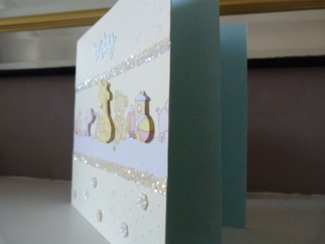 An adorable row of baby toys with giraffe, elephant and toy train decoupaged. Mounted onto quality cream card which has been embossed into a dotty design. Embellished with fairy glitter, pretty flower beads and baby cut from blue pearlised card.