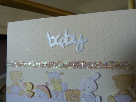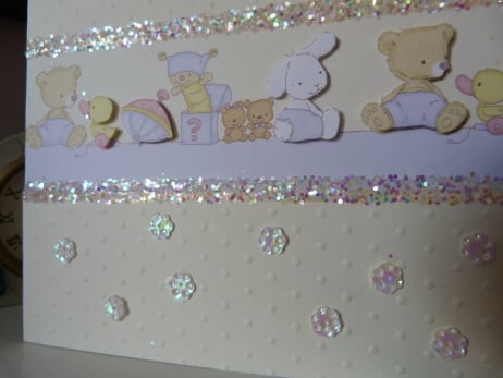 A delightful row of baby toys with the rabbit, teddy fear and baby duck decoupaged. Mounted onto quality cream card which has been embossed with dots. Embellished with fairy glitter and flower beads and baby cut from pale blue pearl card.