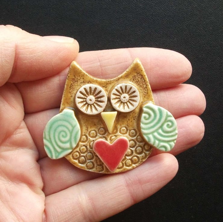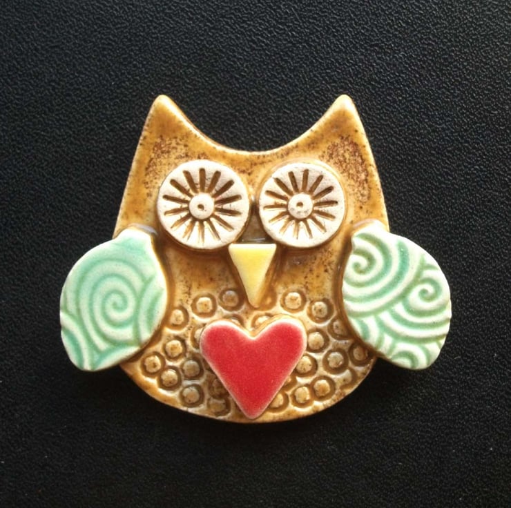 Cute little ceramic owl brooch blue wings