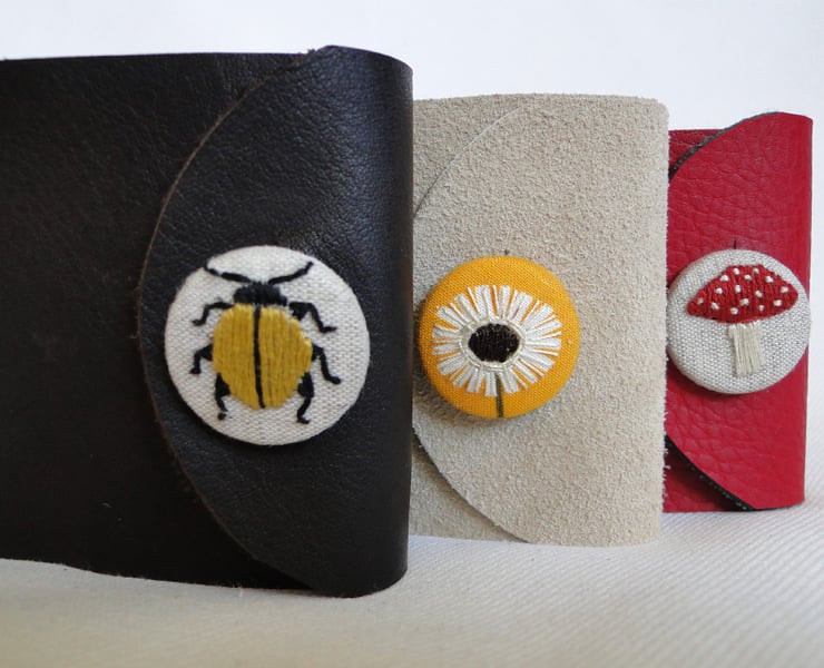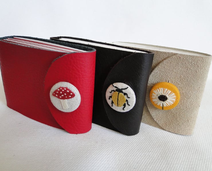 Handmade brown leather journal, bound using waxed linen thread and fastened with an embroidered yellow beetle button.