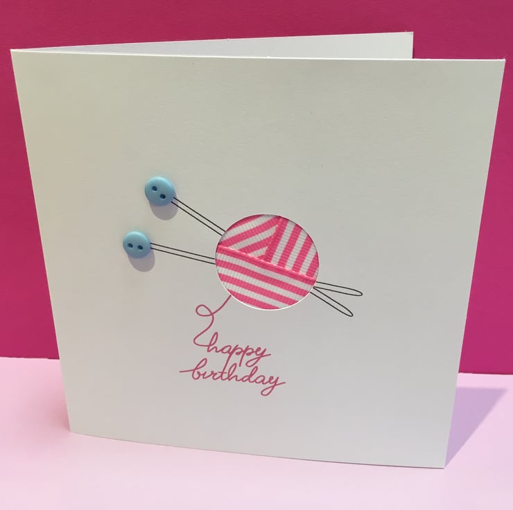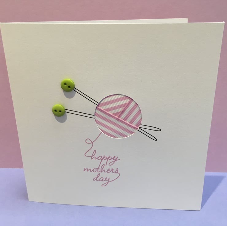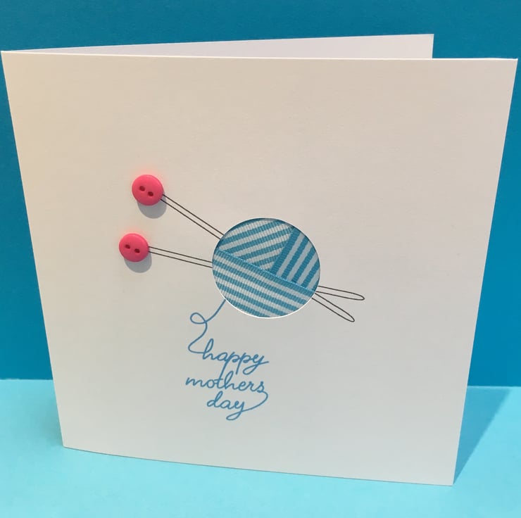 This design makes a great Mother's day card for any happy knitter & Mum! The wool is crossed over ribbon behind a hand cut ball, with buttons at the end of the needles and a printed 'wooly' message!