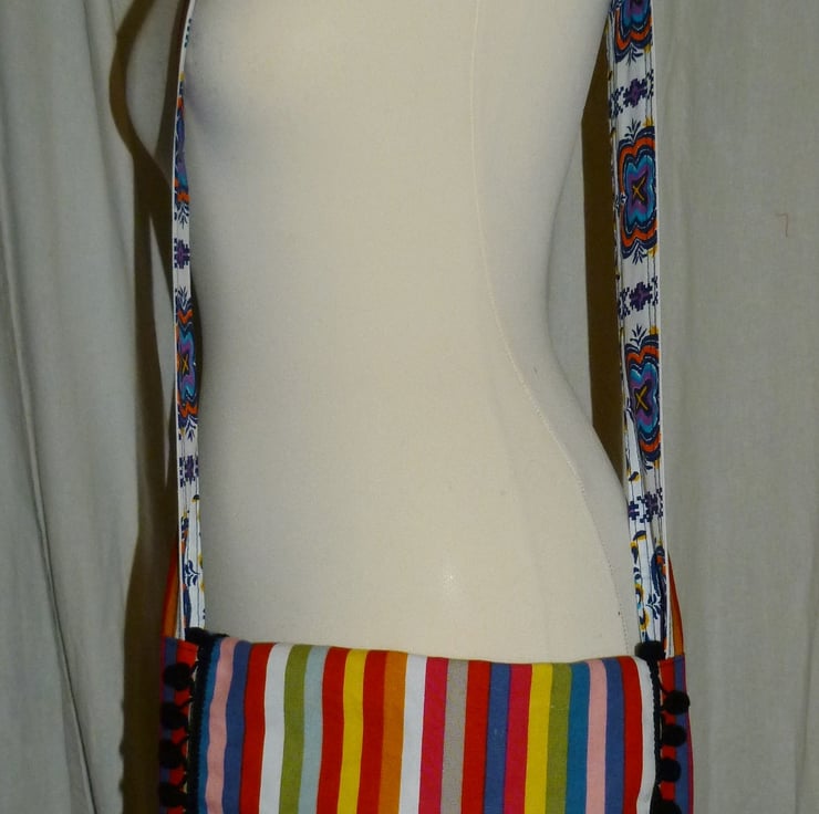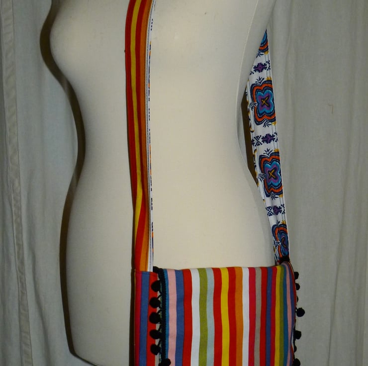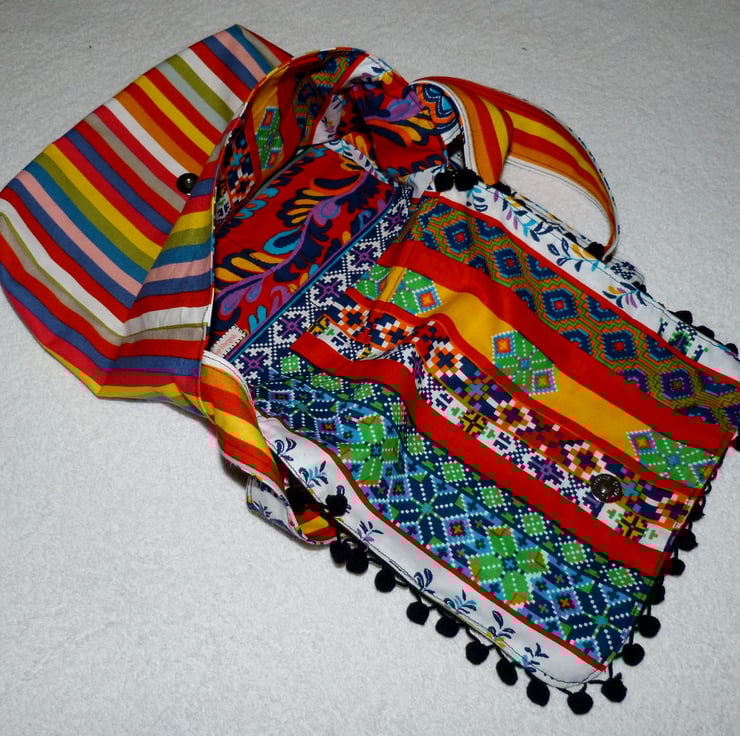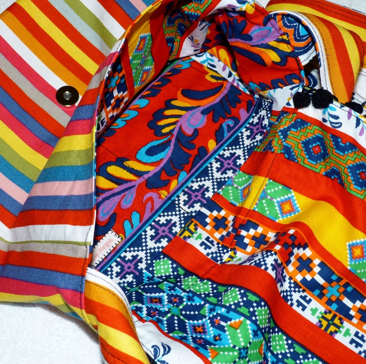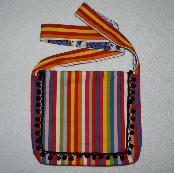 I have created this fantastic shoulder bag from a bright striped upholstery weight fabric. The bag is lined in busy bright print cotton fabric. There are 2 small internal pockets, and a magnetic closure on the flap and decorative tassel trim. The bag is top stitched for a professional finish.