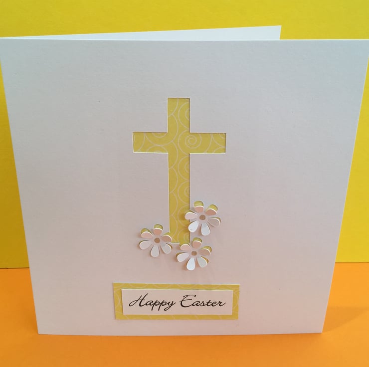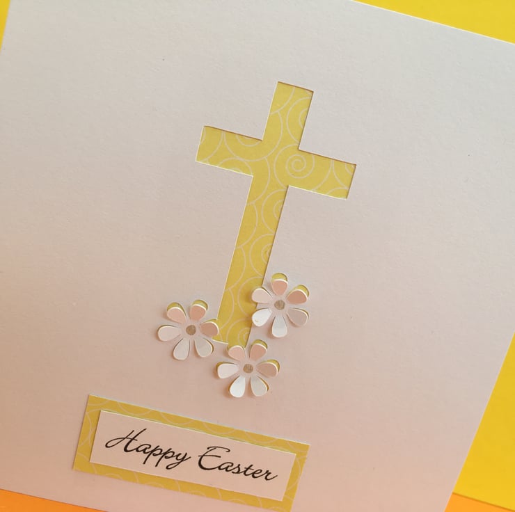This beautiful and delicate Easter card makes a lovely card to send a loved one for Easter. The cross and little flowers have been hand cut to reveal pretty patterned card in a pink or yellow.