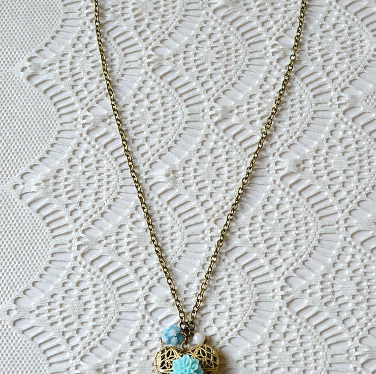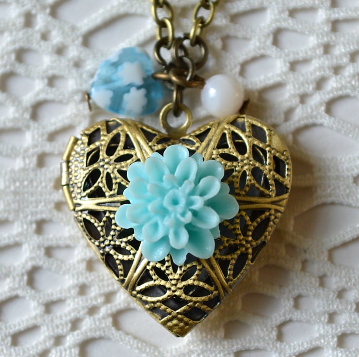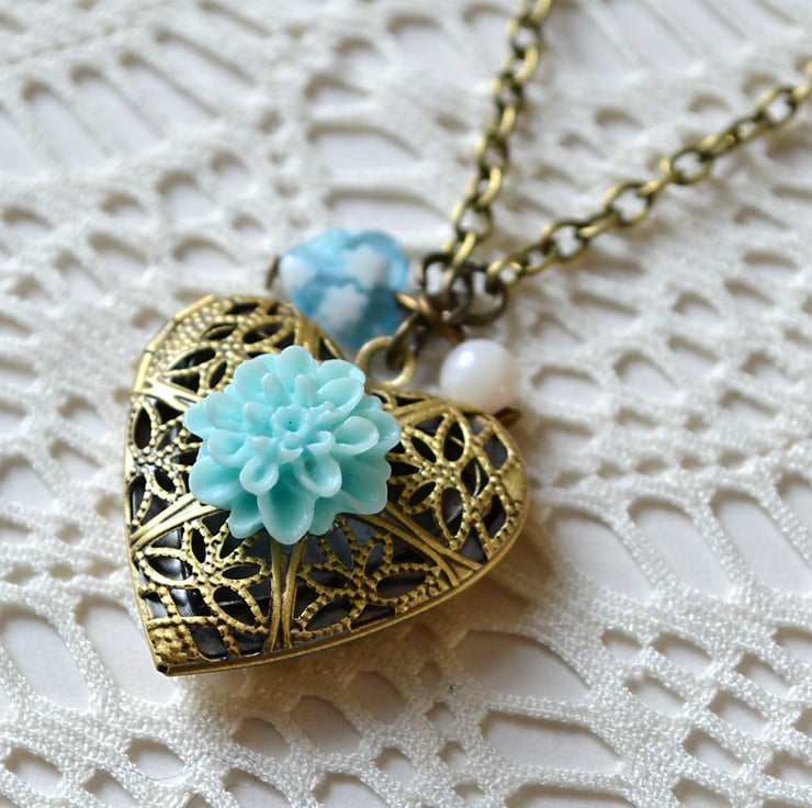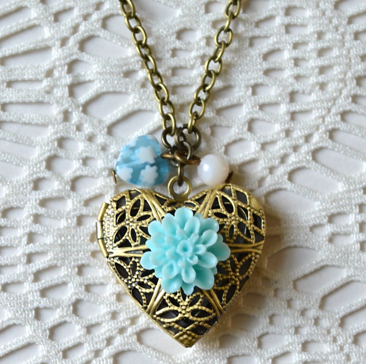 A lovely heart shaped, antique bronze locket with a pale ble Dahlia cabochon, millefiori and bead charms.