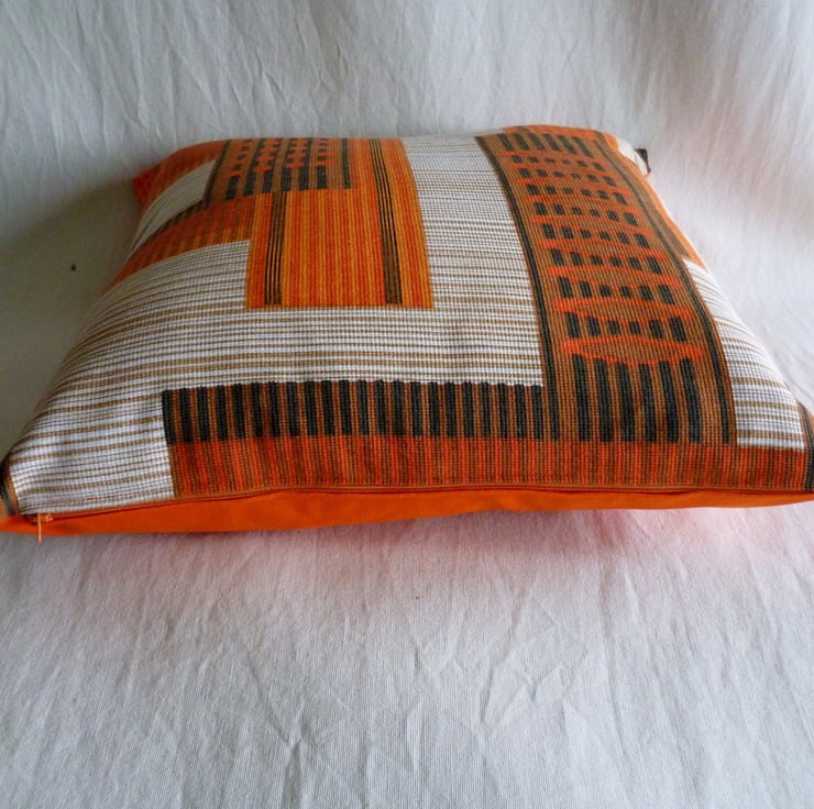 This cushion cover is made from a piece of vintage fabric which has been reclaimed from a curtain. The fabric, which is in excellent reclaimed condition, features a bold geometric pattern very typical of the late 1960s early 1970s in shades of orange and brown on a beige background. The back of the cushion cover is made from plain orange cotton twill and the cover fastens with a zip at the bottom. The cover is made to a high standard and all internal seams are overlocked for strength.
