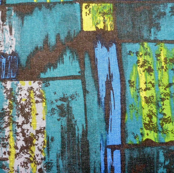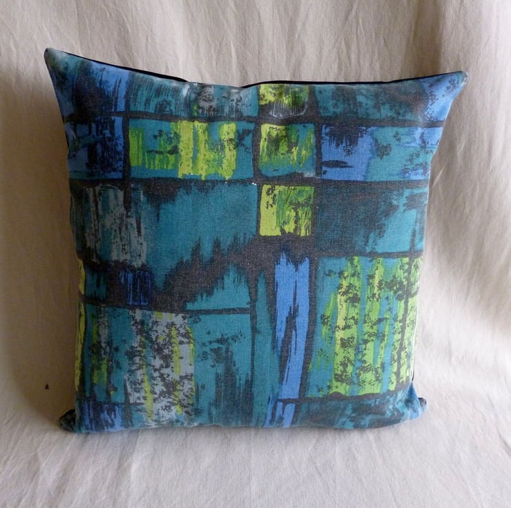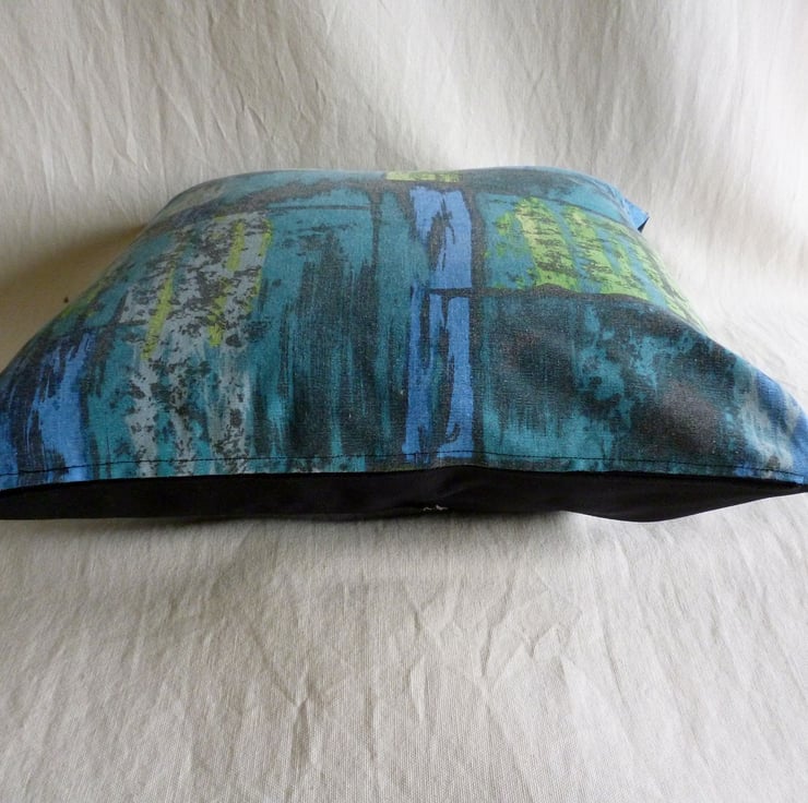 This cushion cover is made from a piece of vintage cotton fabric which has been reclaimed from a curtain. The fabric, which is in very good reclaimed condition, features a random design that looks like brush strokes in shades of blue, black and yellow and dates from the 1960s. The back of the cushion cover is made from plain black cotton drill and the cover fastens with a zip at the bottom. The cover is made to a high standard and all internal seams are overlocked for strength.