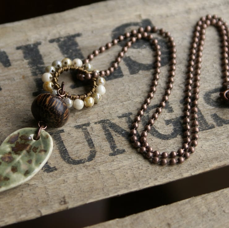The necklace has an antique copper ball chain, which measures approximately 20 inches, and is fastened at the back with a sturdy copper lobster clasp.