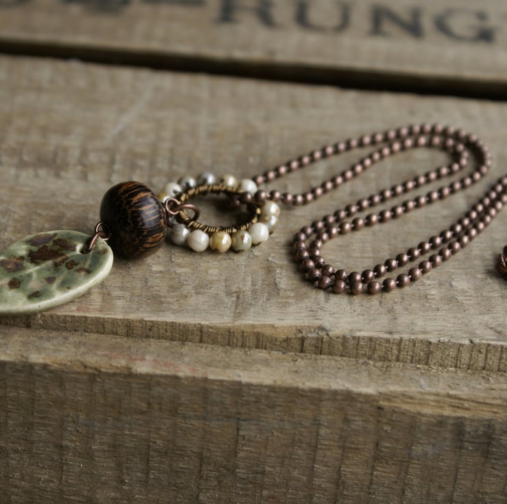 This lovely necklace features a ceramic leaf pendant, which has been handmade by UK artist Bo Hulley. The leaf is a lovely, soft shade of sage with flecks of bronze.