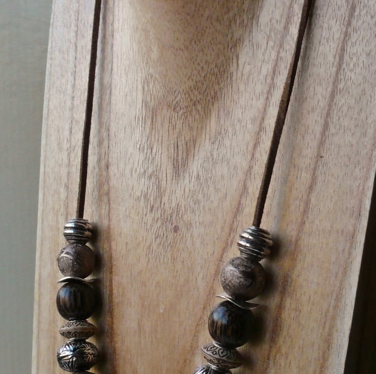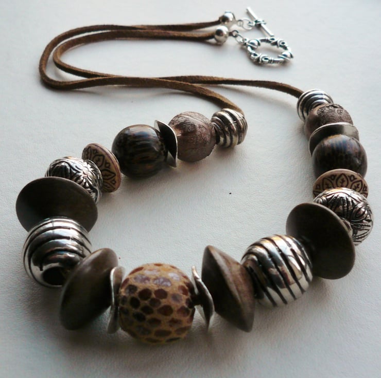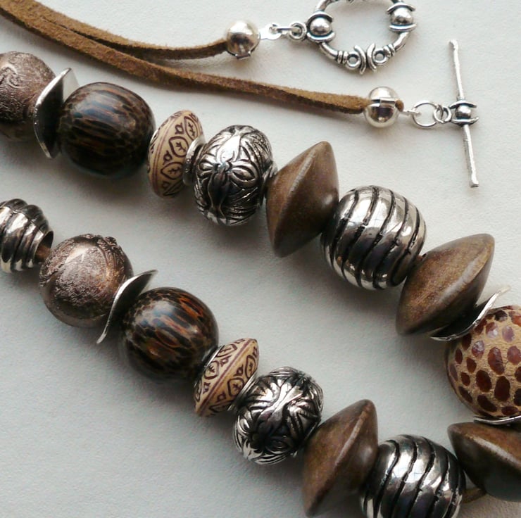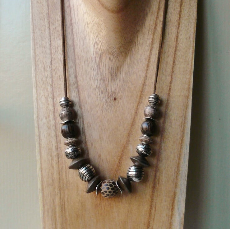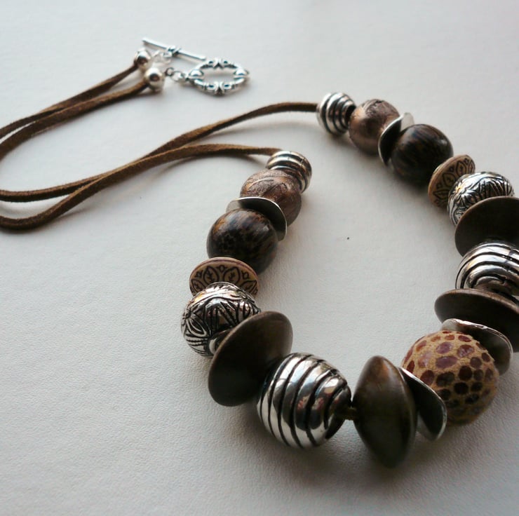 This necklace is made up of various brown shaded and silver beads in the form of wood, resin, Tibetan silver and metalised silver. Largest central leather snakeskin-effect round bead measures 15mm with other beads graduating down to 10mm. All threaded onto 3mm thick caramel coloured faux suede cord with silver plated toggle clasp.