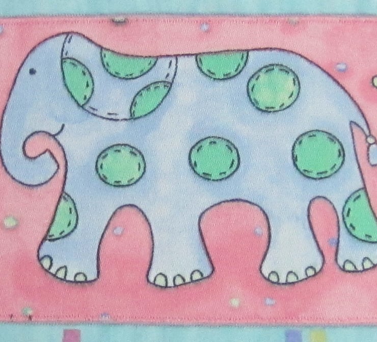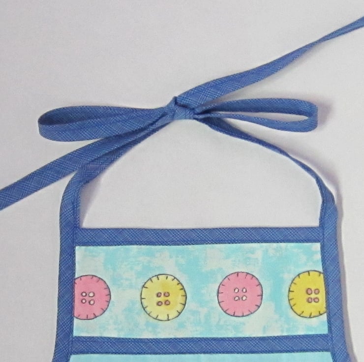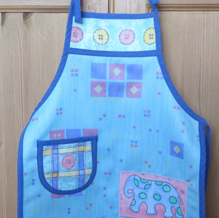 Child's apron appliqued with an elephant patch and button on pocket. Suitable for a child aged about 2 to 3 years old. Measures 37.5 cm wide and 46 cm long. Ties at neck and waist with a bow.