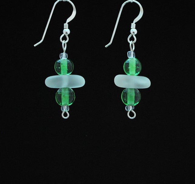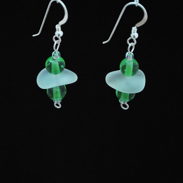 We have used a matching pair of pieces of white beach glass and glass beads to make these pretty earrings. The beach glass has been tumbled so it is perfectly smooth. The white of the glass looks lovely and fresh with the light green beads. The earrings have been finished with sterling silver ear wires.