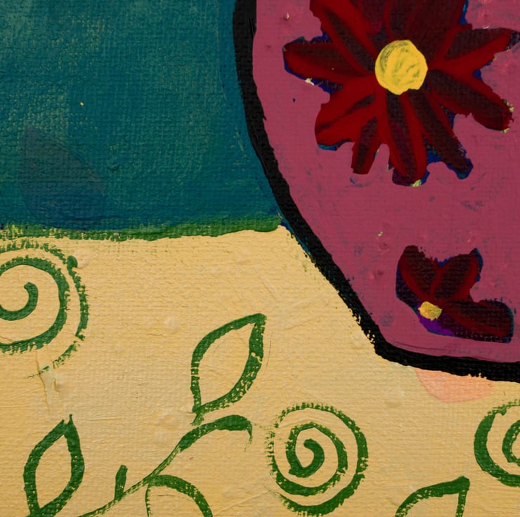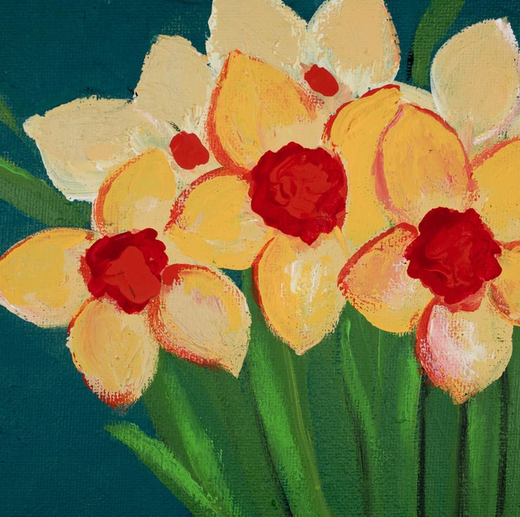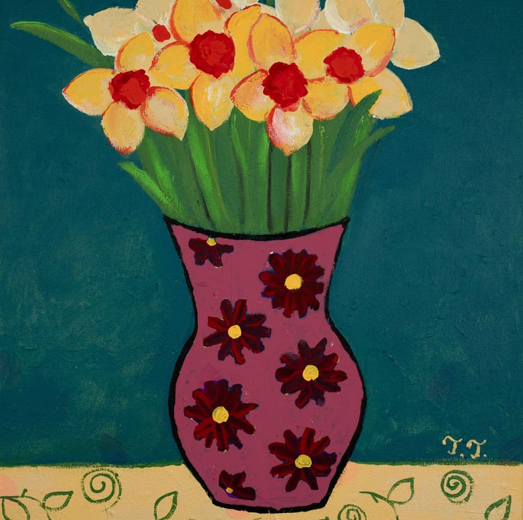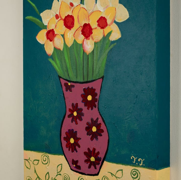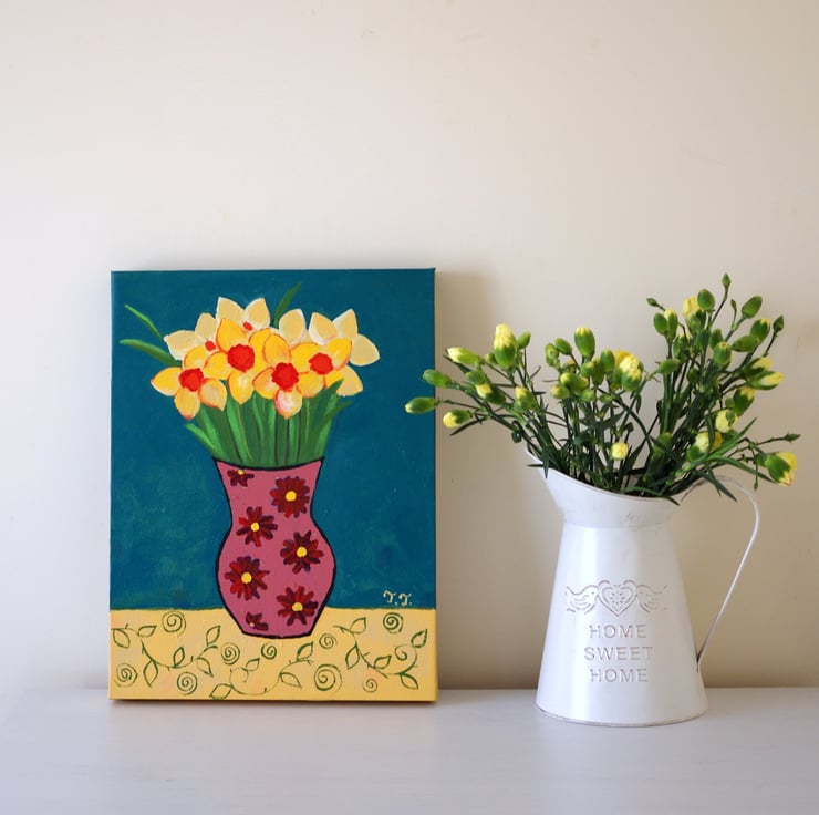 Original still life and floral painting featuring a daffodils bouquet in a vase with a floral pattern. the yellow daffodils really stand out against the teal background and the dusty pink vase with red flowers bring the painting together. Painted on the edges and ready to hang. Size: 12" x 16" x 1.5. Title: "The Joy of Spring". The painting comes with a Certificate of Authenticity. It could be the perfect gift for Mother's Day as well as wedding, anniversary or other occasions.