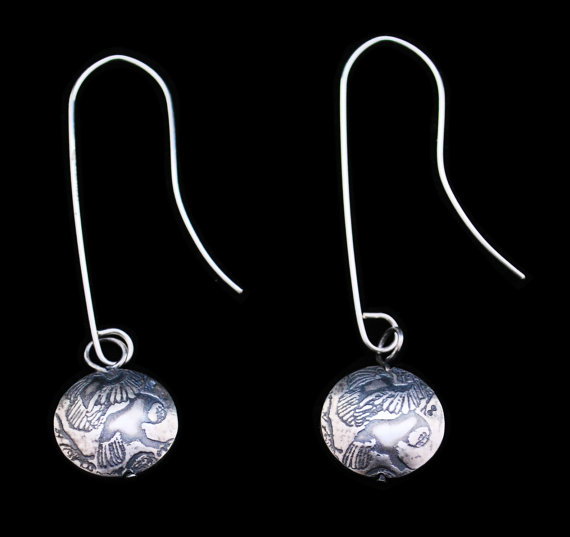 These sterling silver owl capsule drop earrings have had an etched design impressed into the surface from copper plate, etched by myself using environmentally friendly processes. Silver is approximately 80% recycled. I produce designs by hand or digitally and transfer these onto metal using modern etching techniques. The silver capsules have been patinated and treated to protect the patina.