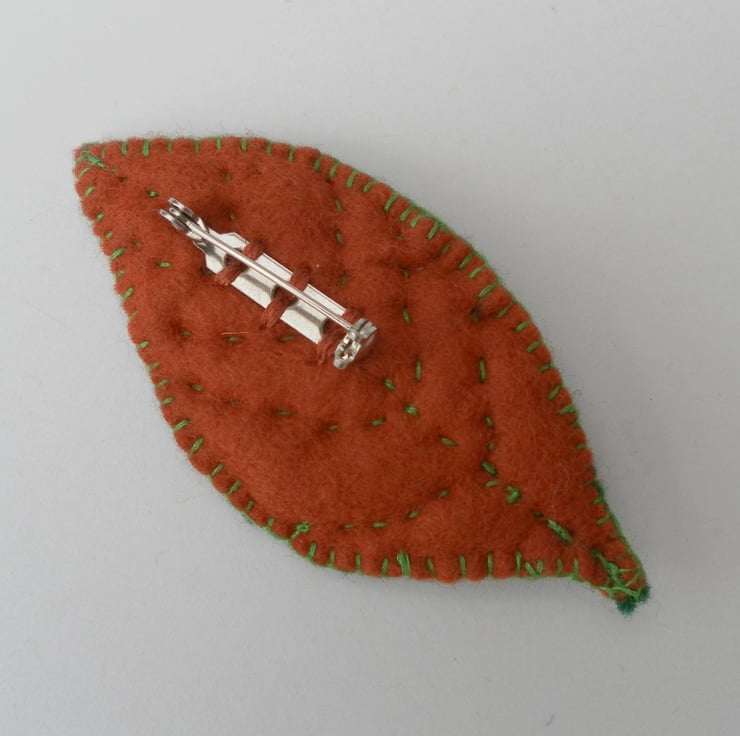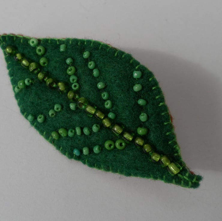 An attractive green, beaded, felt leaf brooch, with a brown felt back. A unique, one off design, hand sewn by me and exclusive to you. It has brooch pin securely sewn to the back, is lightly padded and is 8 cm x 3.5 cm.