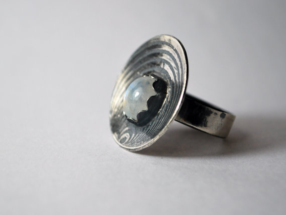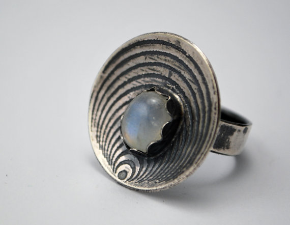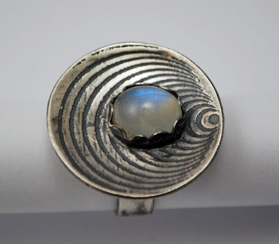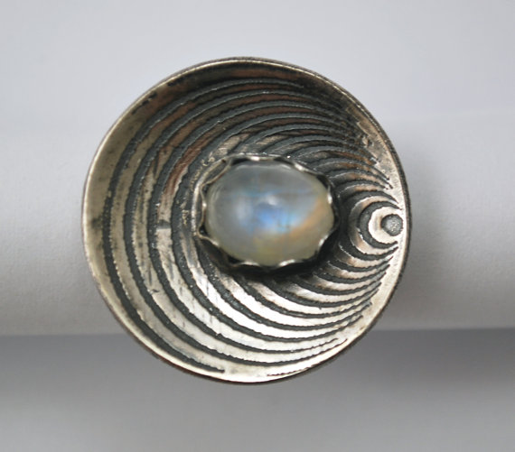 This sterling silver and sumptuous moonstone ring has been completely handmade by me in my Yorkshire based home studio in the UK. The 5mm wide sterling silver band can be made to your specific ring size (Please let me know your size upon checkout) The beautifully domed sterling silver front features a mesmerising optical illusion pattern which has been oxidised to emphasise this fabulous design: nestled within is a gorgeous oval moonstone in a hand cut petal shaped silver bezel. A truly lovely statement cocktail style ring that is also comfortable and practical to wear every day.
