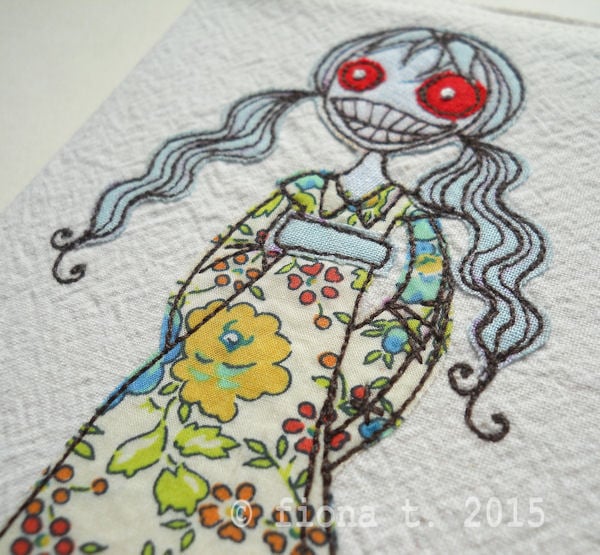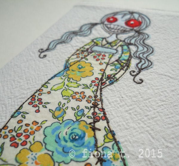 this grinning zombie girl is wearing a pretty liberty print floral dress with pale blue cotton detail that complements her hair. her bright red eyes contrast with her deathly pale blue linen face, & her eyeballs are hand embroidered.