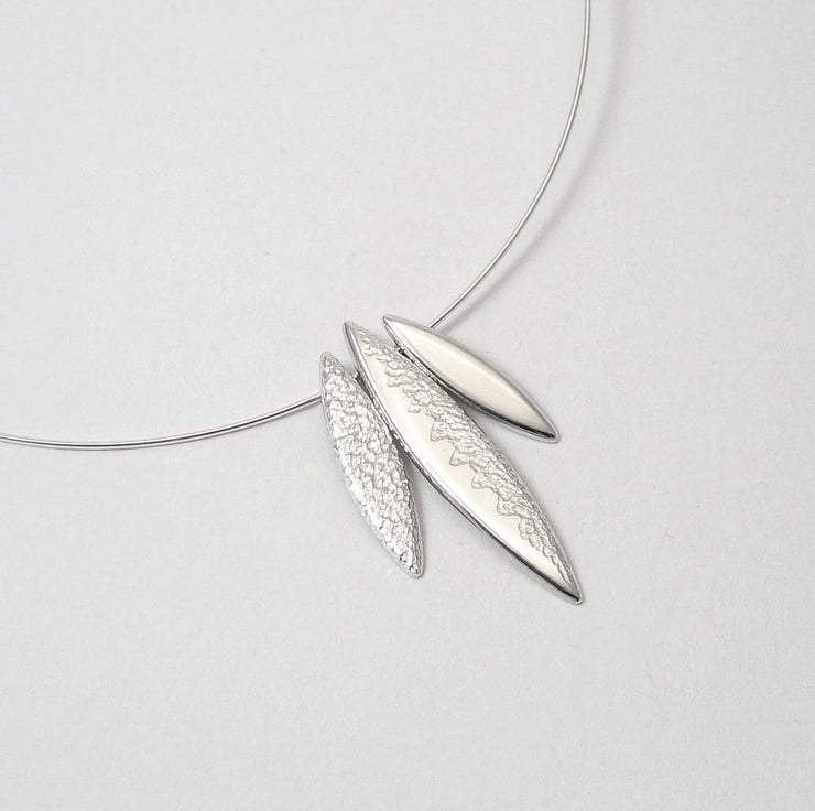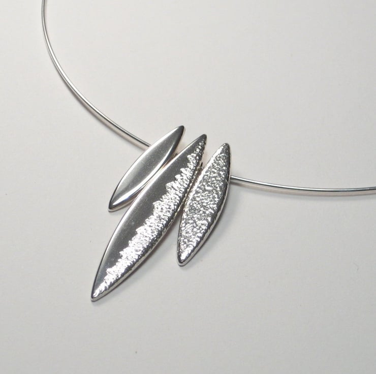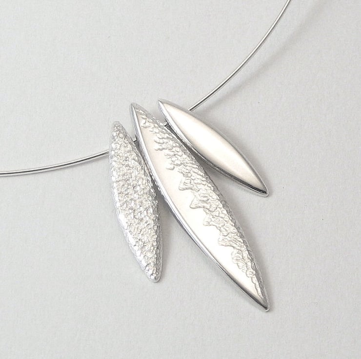 Handmade in my Yorkshire studio, this Sterling Silver Necklace has three separate drops and has the flexibility that they can be worn together as shown in the photo, or individually. Each drop is a different size and has a different finish. The texture is hand applied so each piece is unique. They all have a concealed silver tube on the back and they hang from a 16" solid Sterling Silver wire.