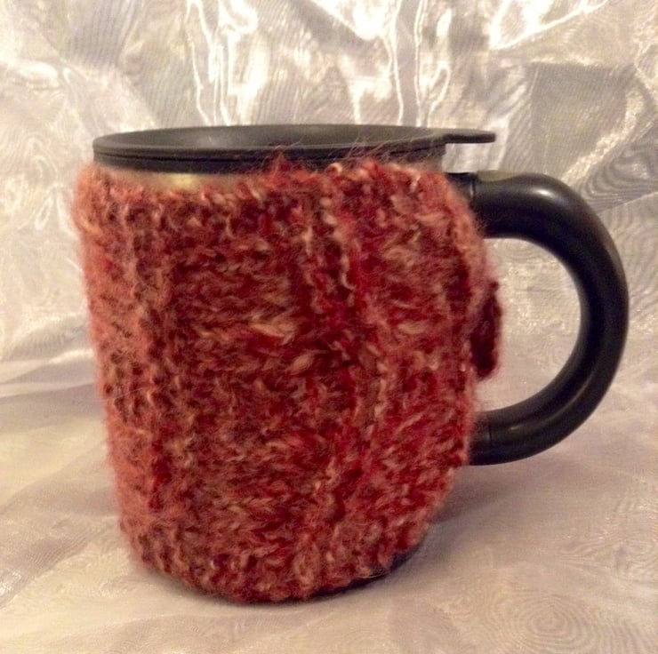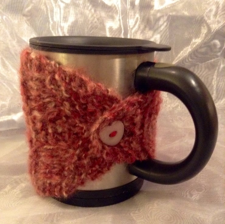 Pretty knitted pink wool mug warmer with heart button close. Fits a regular sized mug. Hand wash only.