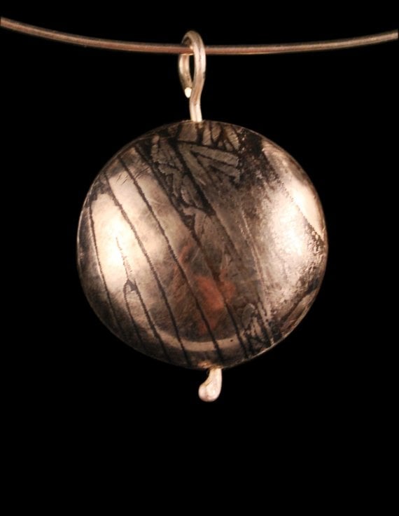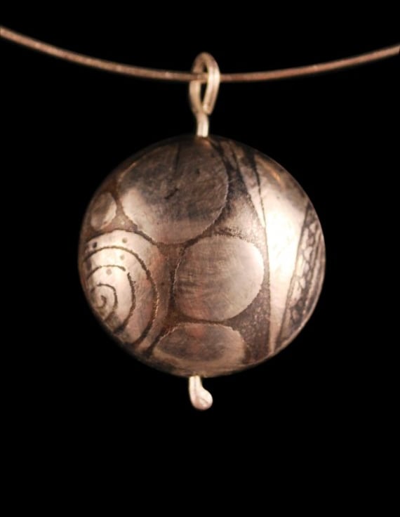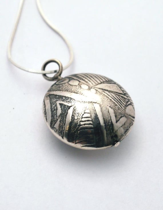 This sterling silver capsule pendant has had an etched design impressed into the surface from steel plate, etched by myself using environmentally friendly processes. I produce designs by hand or digitally and transfer these onto metal using modern etching techniques. The locket style silver capsule has been patinated and treated to protect the patination.