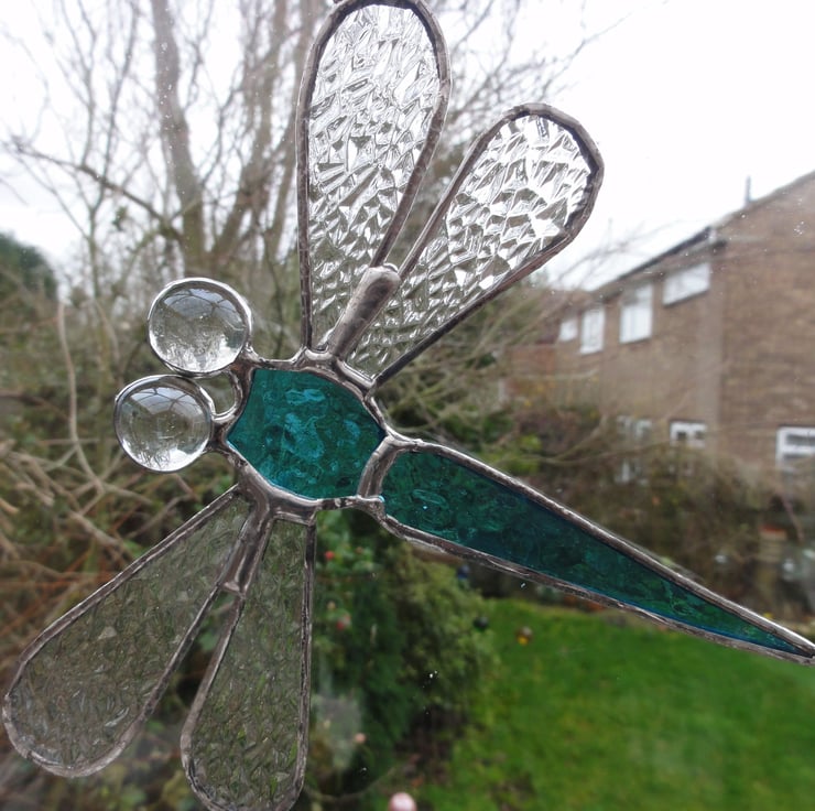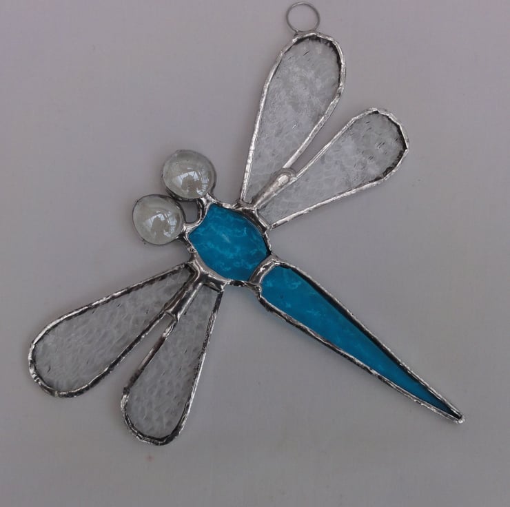 This dragonfly has been made from a beautiful sky blue/pale turquoise textured glass and ice crystal glass for the wings. Each piece of glass as been copper foiled and soldered together. Glass nuggets have been attached for the eyes. I have attached a wire ring for hanging purposes and will supply one window hook so that you can had the sun catcher in your window as soon as received.