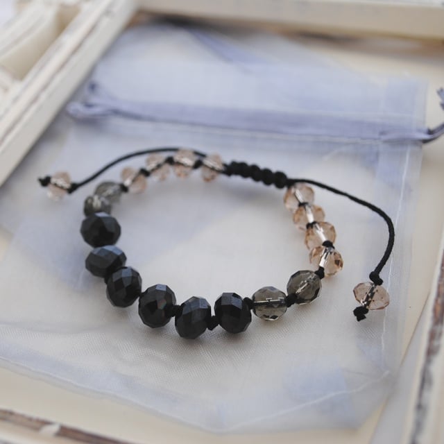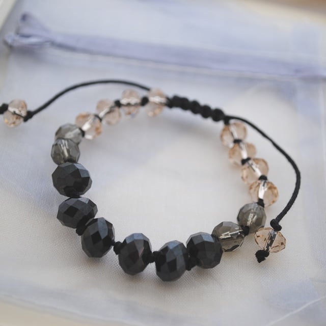 The bracelet features high quality rondelle shaped crystals in black, black diamond/ grey fire-polished crystals and small champagne crystal rondelle beads.