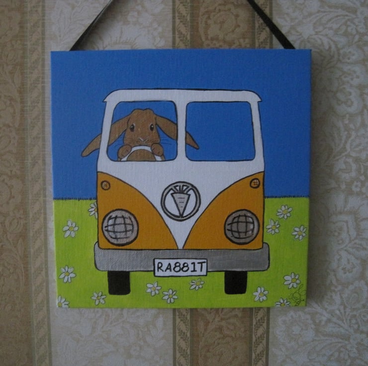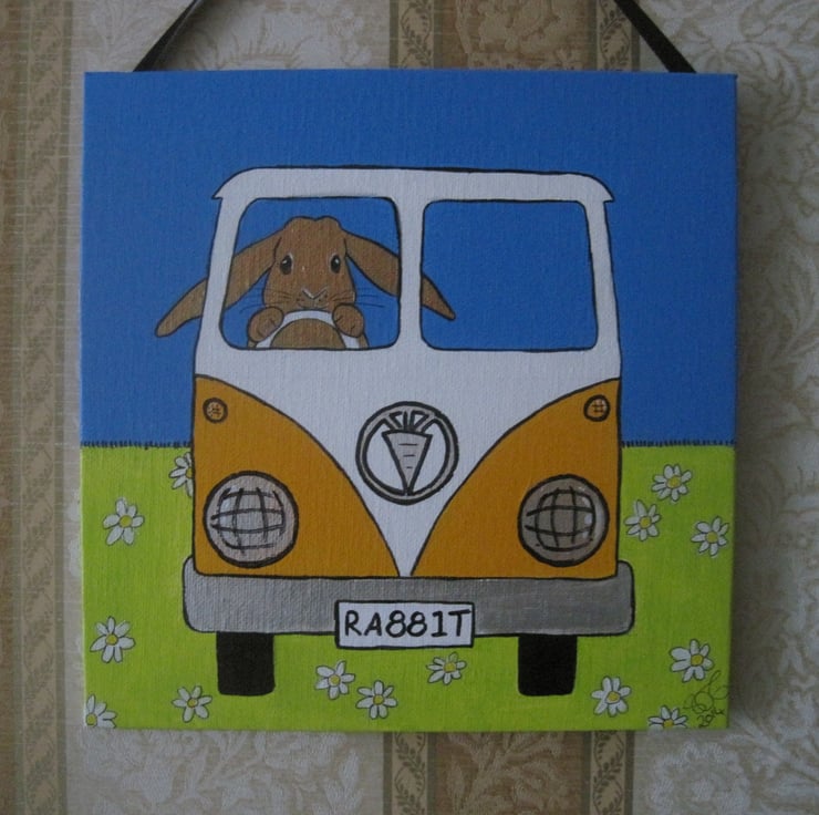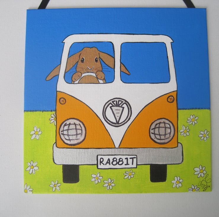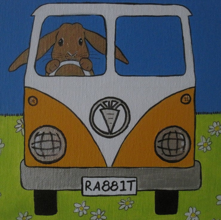 Key words: bunny bunnies rabbit rabbits Easter present gift art worl artwork picture painting camper van campervan ( not VW ) car drive driving original