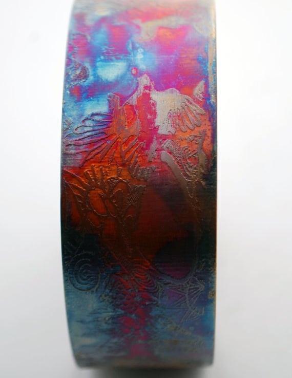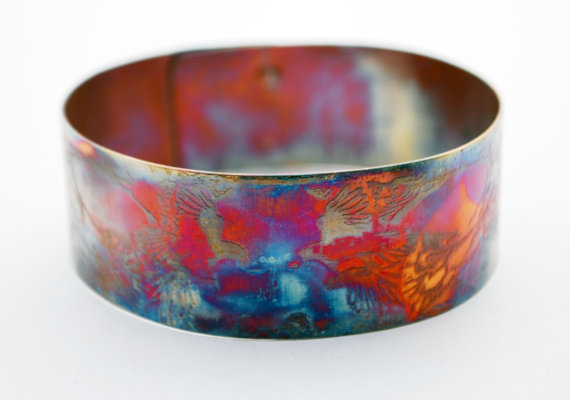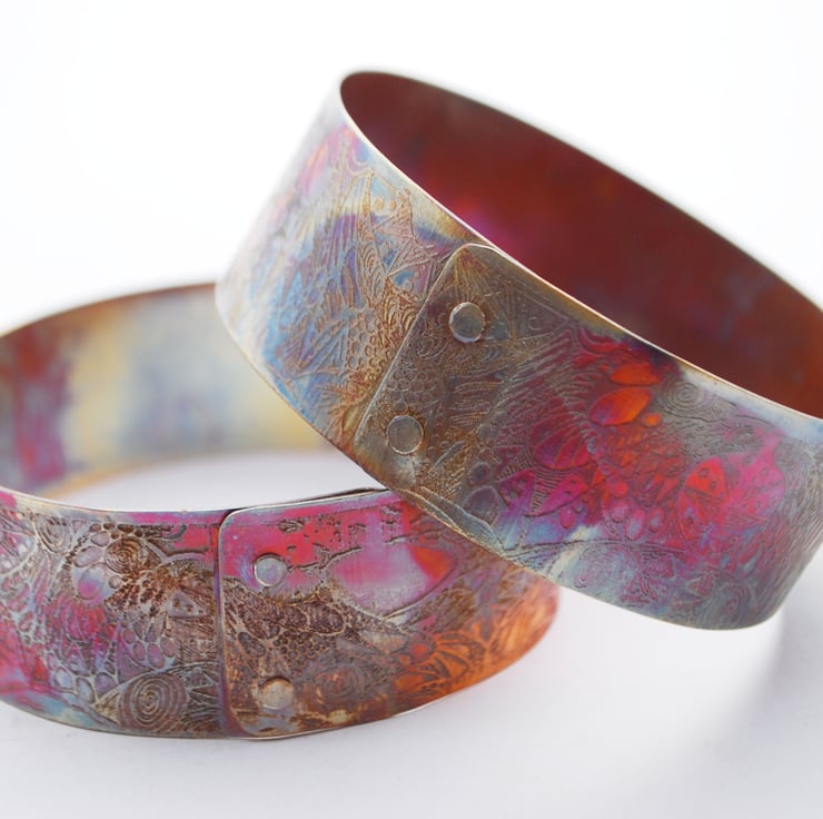 This copper magpie bracelet bangle is one of my crow bracelet designs that is formed into a full circlet with two copper rivets fixed firmly into the rear of the piece. The finished form has then been heat treated to create a glorious iridescent, rainbow patina.