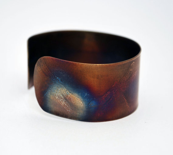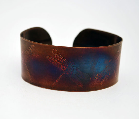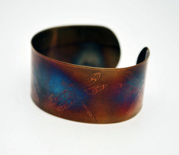 This steel multi-coloured cuff has the image of dragonflies etched onto the surgical steel surface, polished to create definition and contrast. It has been heat coloured using a jeweller's torch and treated during the cooling process to fix the patina, which is very durable and if the accompanying colour care proceedures are observed, will not fade. The colours are very deep and vibrant, and range from orange, purple, dark blue, light blue, and in some cases, lemon yellow, peach and green. I use environmentally friendly etching processes when producing my designs, and each piece is subtly unique. This will not tarnish as it is polished stainless steel.