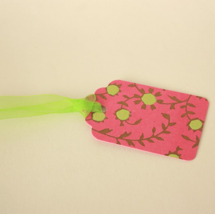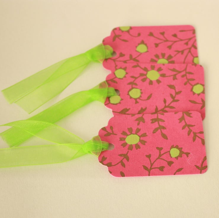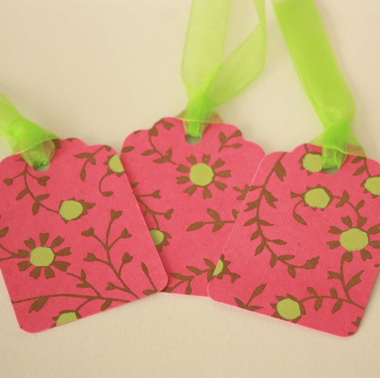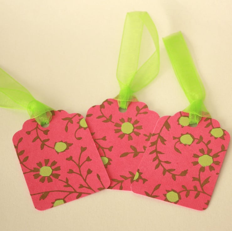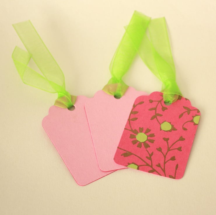 Pack of 3 gift labels with pretty pink and green patterned paper, die cut and mounted on 240gsm pink card. The back of each tag is left blank for your own message.