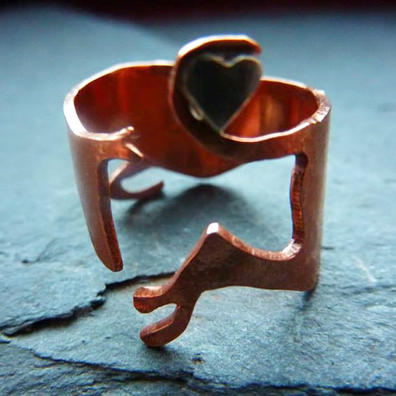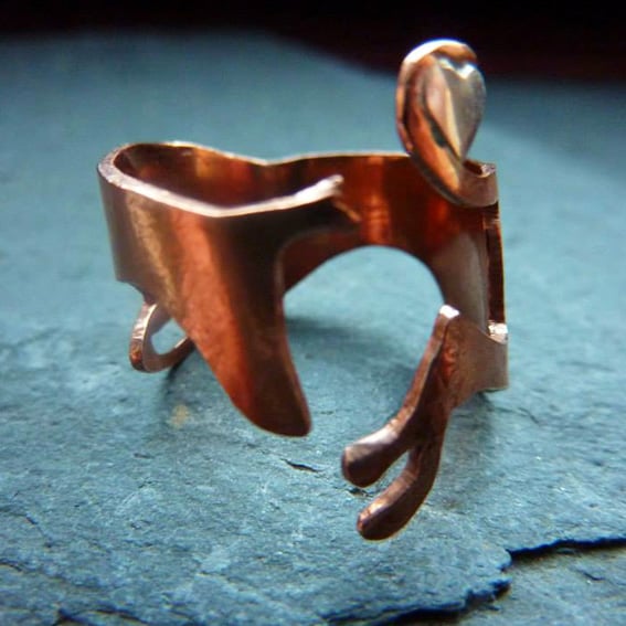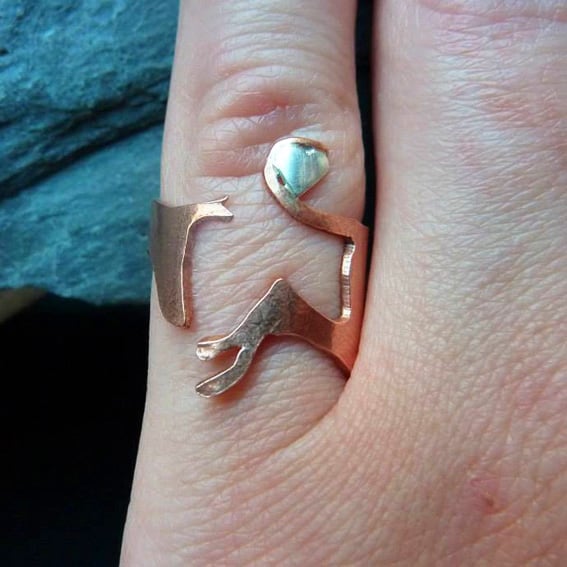 Adjustable copper and sterling silver running hound ring.
