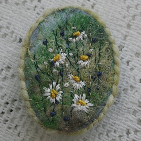 Cheerful daisies are quite at home in the felted meadow background of this embroidered brooch.