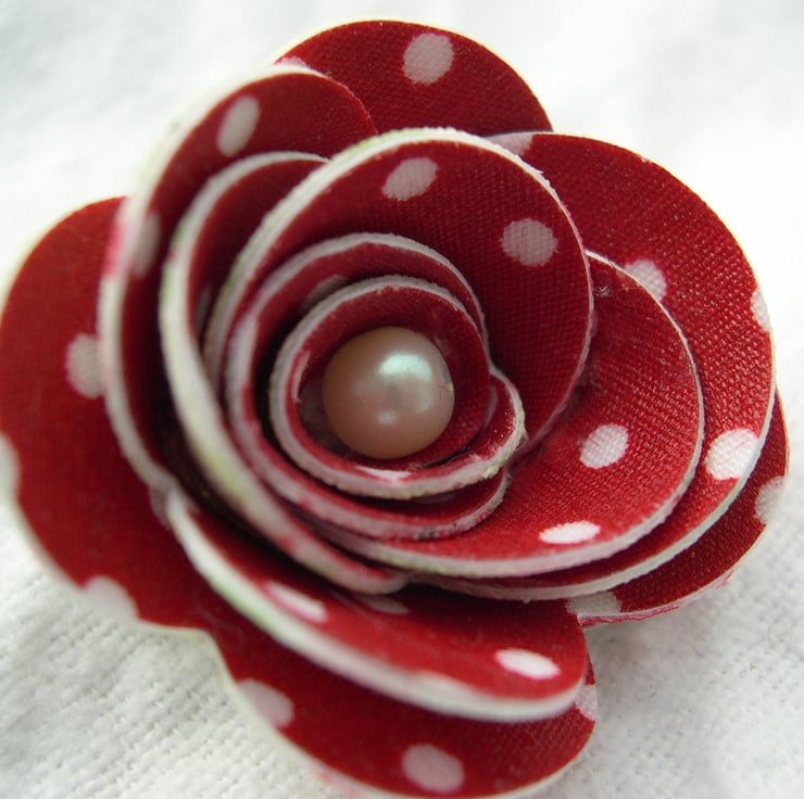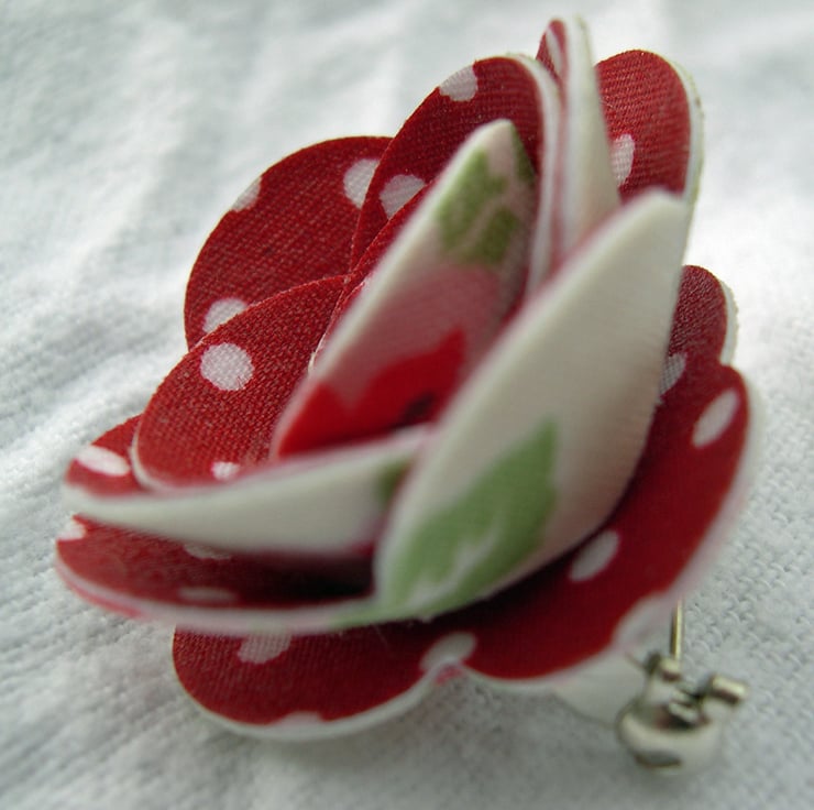 Hardened Fabric Floral and Red Polka Dot Rose Brooch