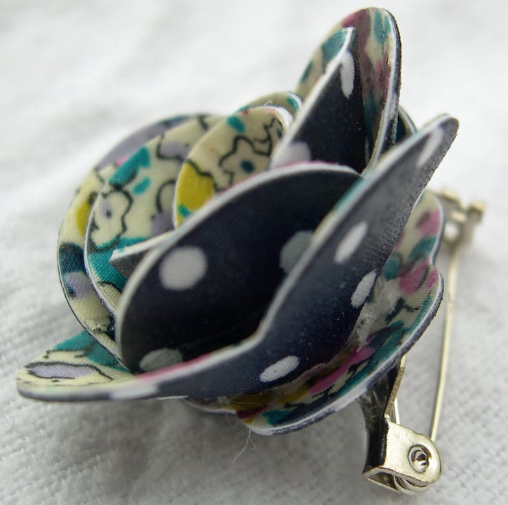 This charming brooch is made of hardened offcuts of cotton Liberty print fabrics hand sculptured into a rose shape with a faux pearl set within it. The design is then set upon an silver plated brooch bar.