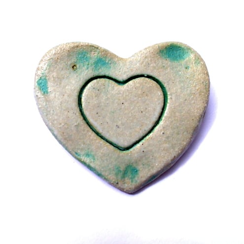 This handmade ceramic heart shaped brooch is cream and green in colour, with another impressed heart on the surface. Glazed with a silky smooth finish. Ideal to pin on a coat or any other clothing. Also looks great pinned on a handbag. My brooches are individually cut to shape, smoothed when dry, engraved, glazed and fired. A silver plated brooch clasp has been carefully attached to the back.