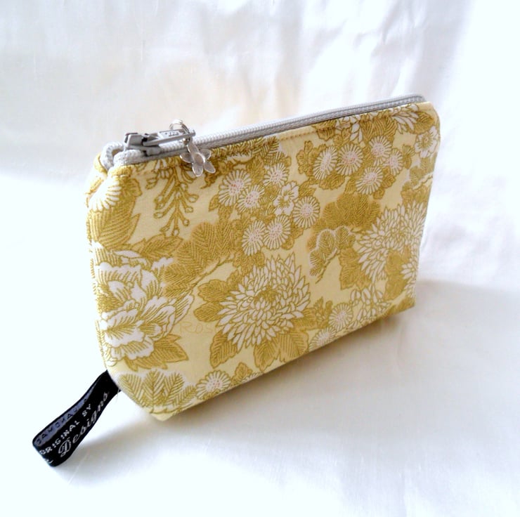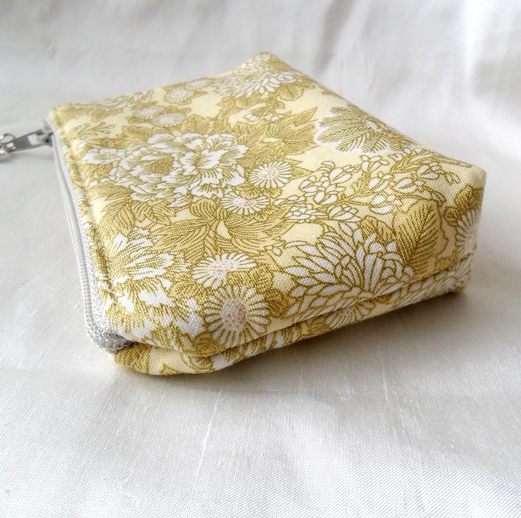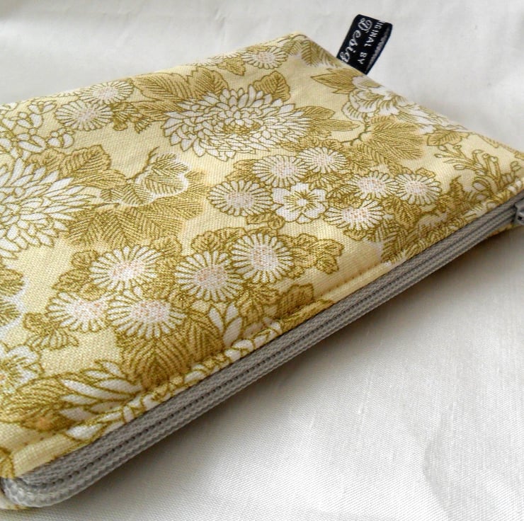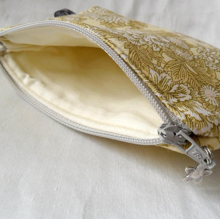 A very useful handmade coin purse made in a gold floral print cotton that has a lovely metallic sheen. The zip pull has a small flower charm attached and the lining is a plain cream cotton. The purse is large enough to carry cash, cards, keys and even a standard size phone!