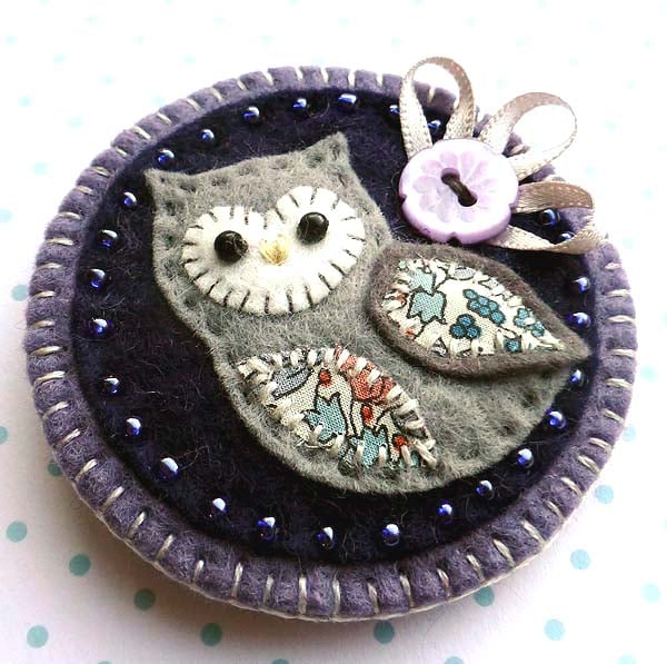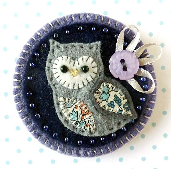 It features a little felt owl with appliqued wing and belly in pretty Liberty of London print fabric. It is mounted onto a deep blue felt base which is edged with coordinating seed beads. It is further mounted onto a dusky purple felt backing and is finished with a little flower button and ribbon detail. It has a metal brooch pin on the reverse side for easy attachment.