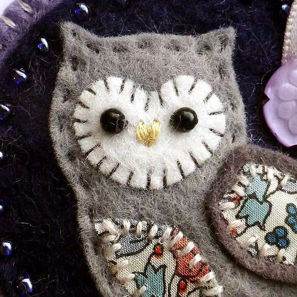 It features a little felt owl with appliqued wing and belly in pretty Liberty of London print fabric. It is mounted onto a deep blue felt base which is edged with coordinating seed beads. It is further mounted onto a dusky purple felt backing and is finished with a little flower button and ribbon detail. It has a metal brooch pin on the reverse side for easy attachment.