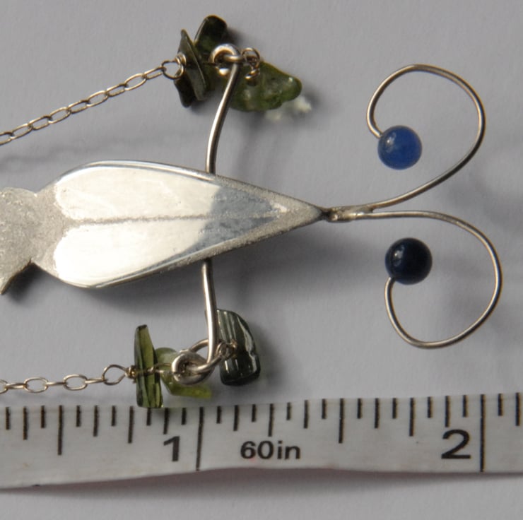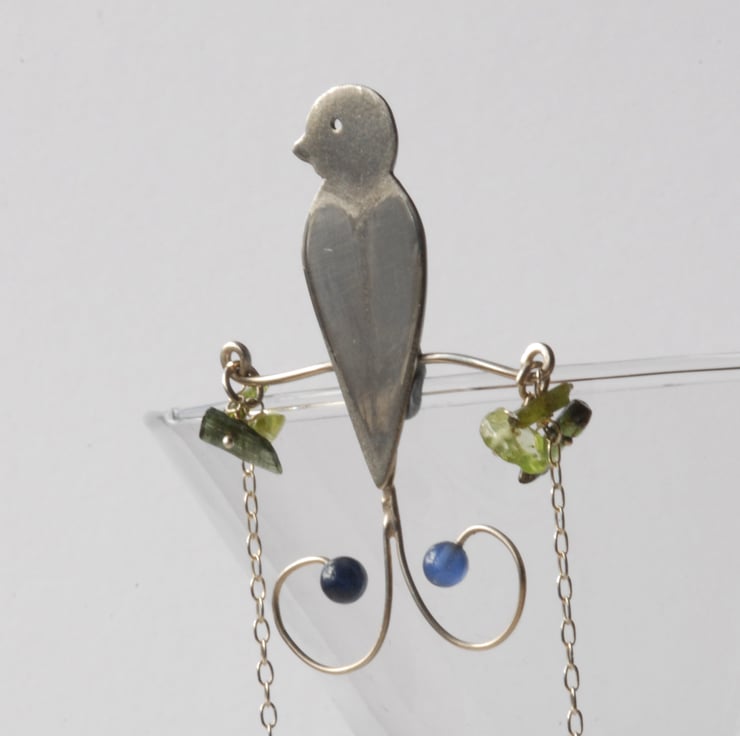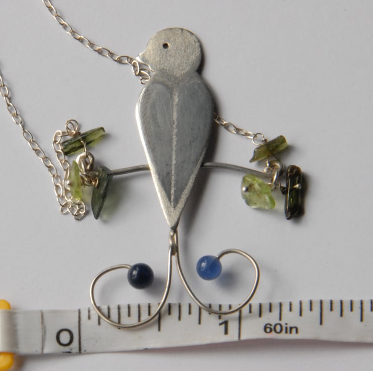 In this statement necklace a sterling silver tropical bird with long curly tail feathers tipped with blue sodalite rounds perches on a branch with little green tourmaline chips as leaves. The silver has matt and polished finishes and the necklace is finished off with silver chain and clasp.