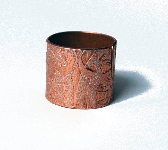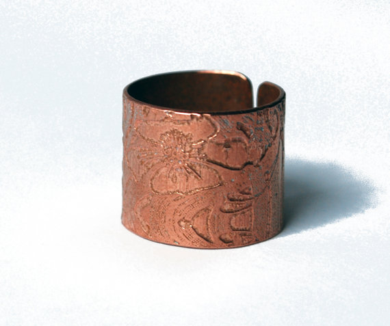 This etched copper ring is etched with an art nouveau floral pattern. It is open at the back, allowing them to be adjusted to size. The copper is etched using non toxic processes, hand cut and formed using traditional jewellery tools. This etched copper ring can be pinched or stretched to size. It comes in natural copper or heat coloured to create a vibrant multicoloured patina: (this will deepen over time.)