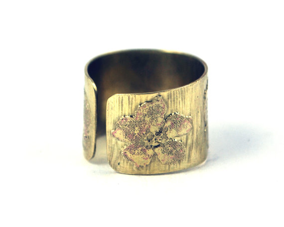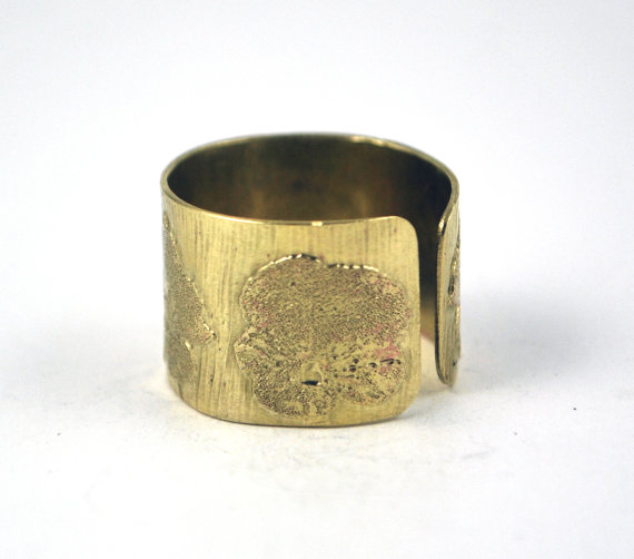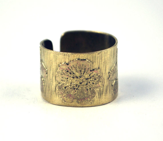 This etched brass ring is etched with a alternating flower pattern. It is open at the back, allowing them to be adjusted to size. The brass is etched using non toxic processes, hand cut and formed using traditional jewellery tools. This etched brass ring can be pinched or stretched to size.